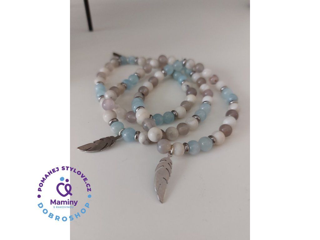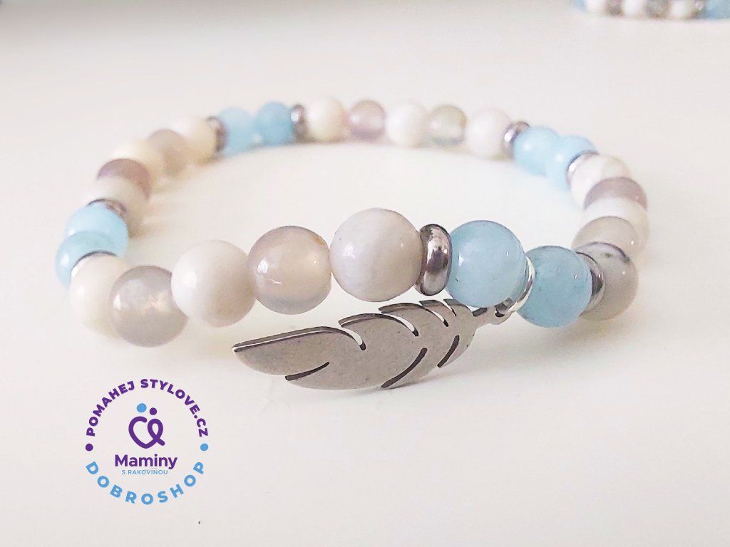 Nebe napodobující modrý náramek, vyrobený z minerálů - modrý fluorit, přírodní howlit a šedý chalcedon. Dále je doplněn nerezovým oddělovacím korálkem a nerez peříčkem.